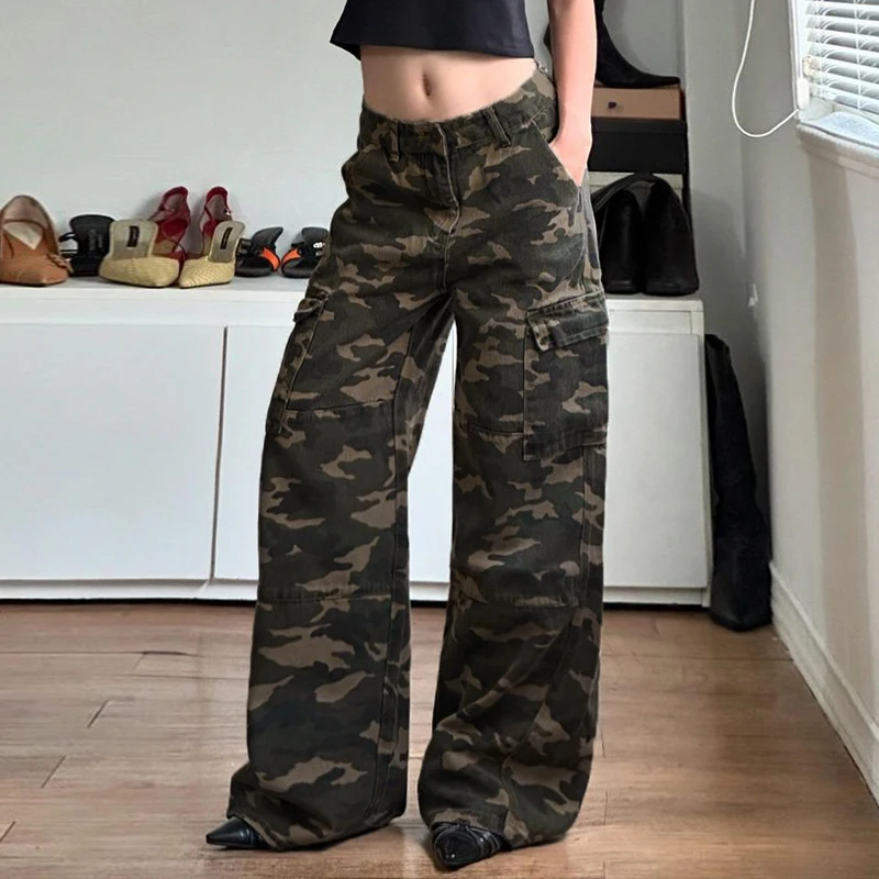 Camouflage Print Loose Low-Waist Straight-Leg Pants Women Y2K Street Hip-Hop Casual Trousers Fashion Versatile Bottoms